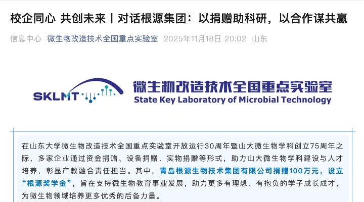 根源集團(tuán)捐贈(zèng)50萬元設(shè)立“根源獎(jiǎng)學(xué)金” 助力山東大學(xué)微生物科學(xué)教育發(fā)展