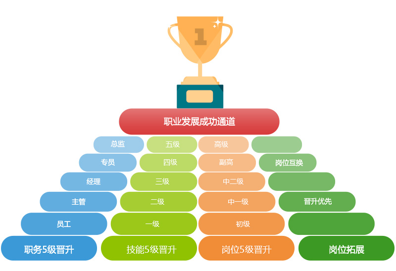 在人力開發(fā)體系的基礎(chǔ)上,集團為保證員工持續(xù)的競爭力、適應(yīng)性,以及不斷的發(fā)展動力,特開發(fā)了“根源特色”的四條發(fā)展通道。在傳統(tǒng)的“技術(shù)和管理”兩個發(fā)展維度的基礎(chǔ)上,增設(shè)了“崗位五級上升通道”及“崗位拓展/輪換上升通道”。集團的每個員工都可以根據(jù)自己的發(fā)展訴求以及自身特點,選擇發(fā)展通道。“通道內(nèi)部可以上升,之間可以互通”,讓每個員工都能在根源得到職業(yè)的發(fā)展,實現(xiàn)職業(yè)的成功。